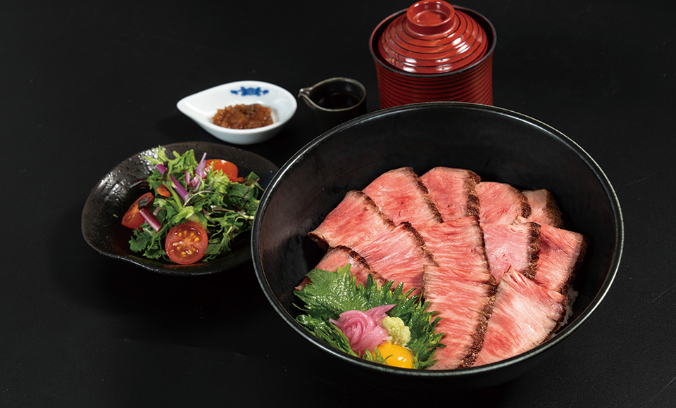 実山椒風味の特製漬汁で下味を付け、自家製ステーキソースで仕上げました。料亭仕込みの丼をどうぞお召し上がりください。