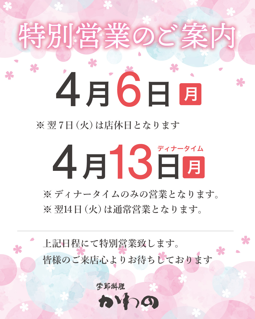 4月の特別営業のご案内